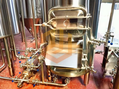 過(guò)濾槽與旋沉罐:采用上下兩層的設(shè)計(jì)方式,整體占地面積小,過(guò)濾槽采用銑制篩板,頂部采用異型人孔設(shè)計(jì),側(cè)面配有出糟口,方形人孔門(mén)設(shè)計(jì)更有利于啤酒麥糟的清理工作,同時(shí)還配有出糟板。內(nèi)部配有耕刀裝置,用于疏松麥糟層以及出糟使用。